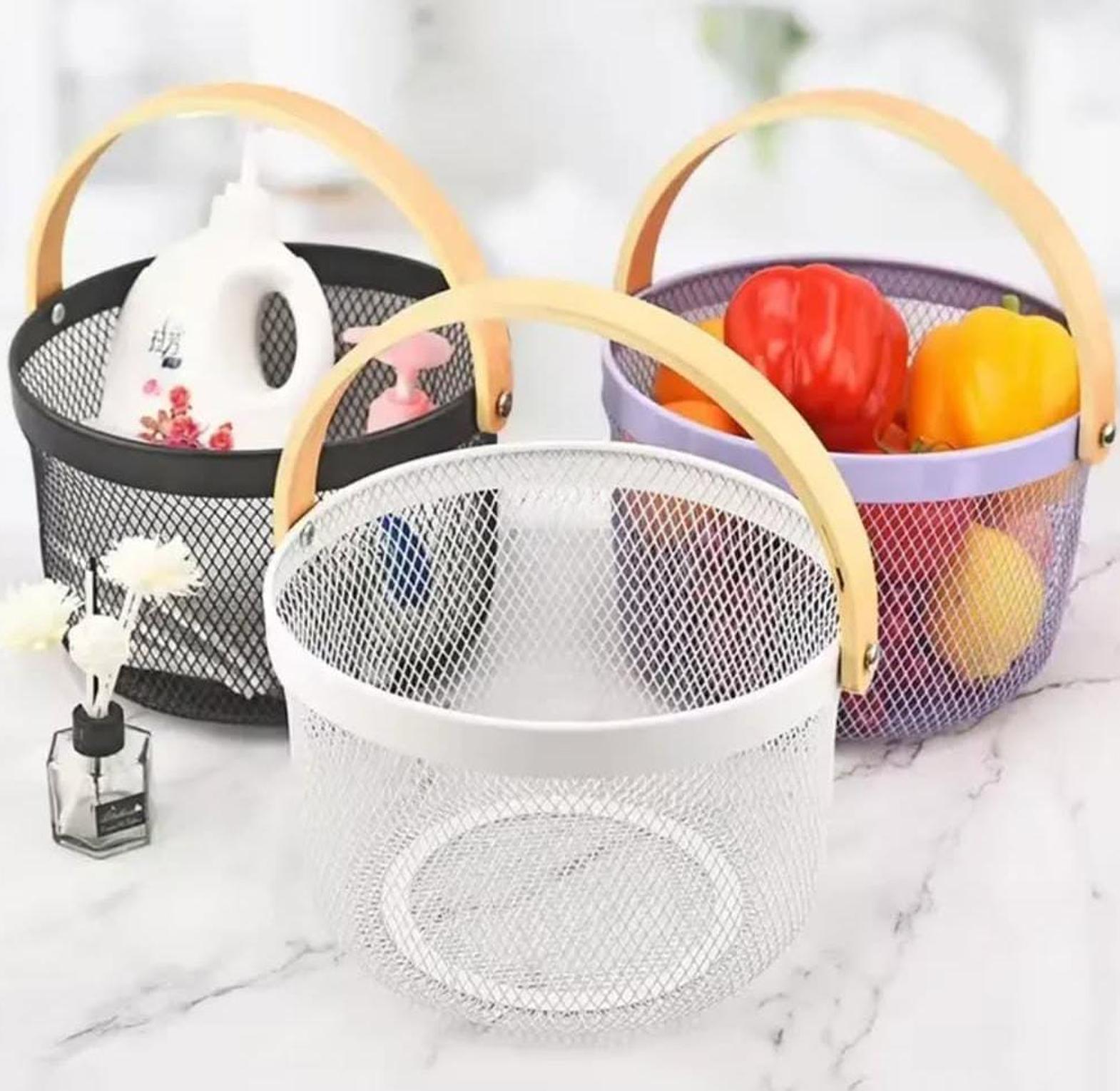 Our multi-purpose round mesh basket with wooden handle offers the perfect blend of utility and rustic elegance, ideal for both storage and display. The breathable mesh metal construction ensures good air circulation—making it suitable for storing fruits, vegetables, bath items, or even craft supplies—while the sturdy wooden handle adds a touch of warmth and makes carrying effortless. Its compact yet roomy design fits seamlessly into kitchens, bathrooms, living rooms, or entryways, allowing you to tidy up clutter while keeping items within easy reach. Whether used as a countertop fruit holder, a stylish toiletry caddy, or a catch-all for keys and mail, this basket adapts to your needs while enhancing the visual appeal of your space. Built to last and easy to clean, it’s a versatile staple for any organized home.