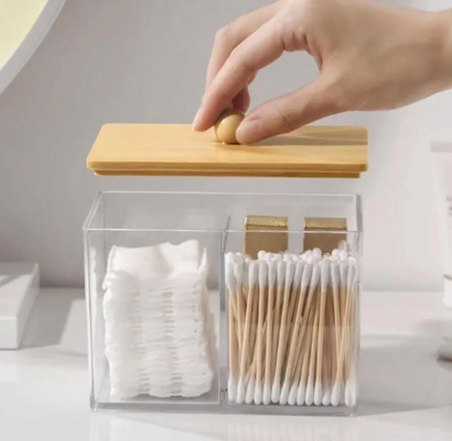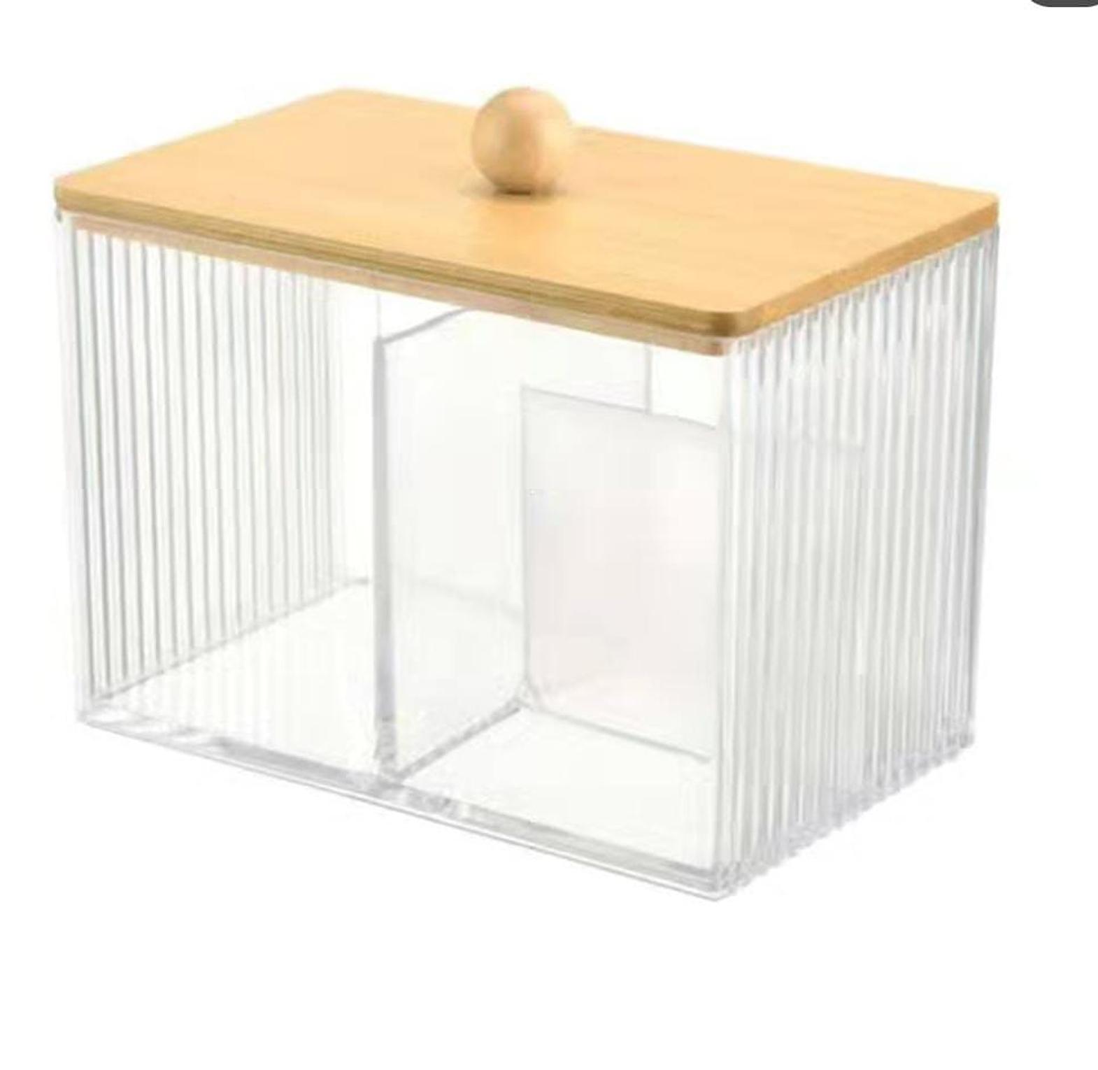 This partitioned acrylic ear bud and cotton swab organizer offers a sleek, functional solution for organizing small items in your bathroom, vanity, or countertop. Made from high-quality acrylic, the transparent design allows easy visibility of contents, while the bamboo lid adds a touch of warmth and sophistication. The partitioned sections help keep cotton swabs, ear buds, or other essentials neatly separated and easily accessible, reducing clutter and enhancing your space. The combination of modern acrylic and natural bamboo ensures durability, while complementing a variety of home décor styles. A practical yet stylish storage option that keeps your items tidy and within reach.