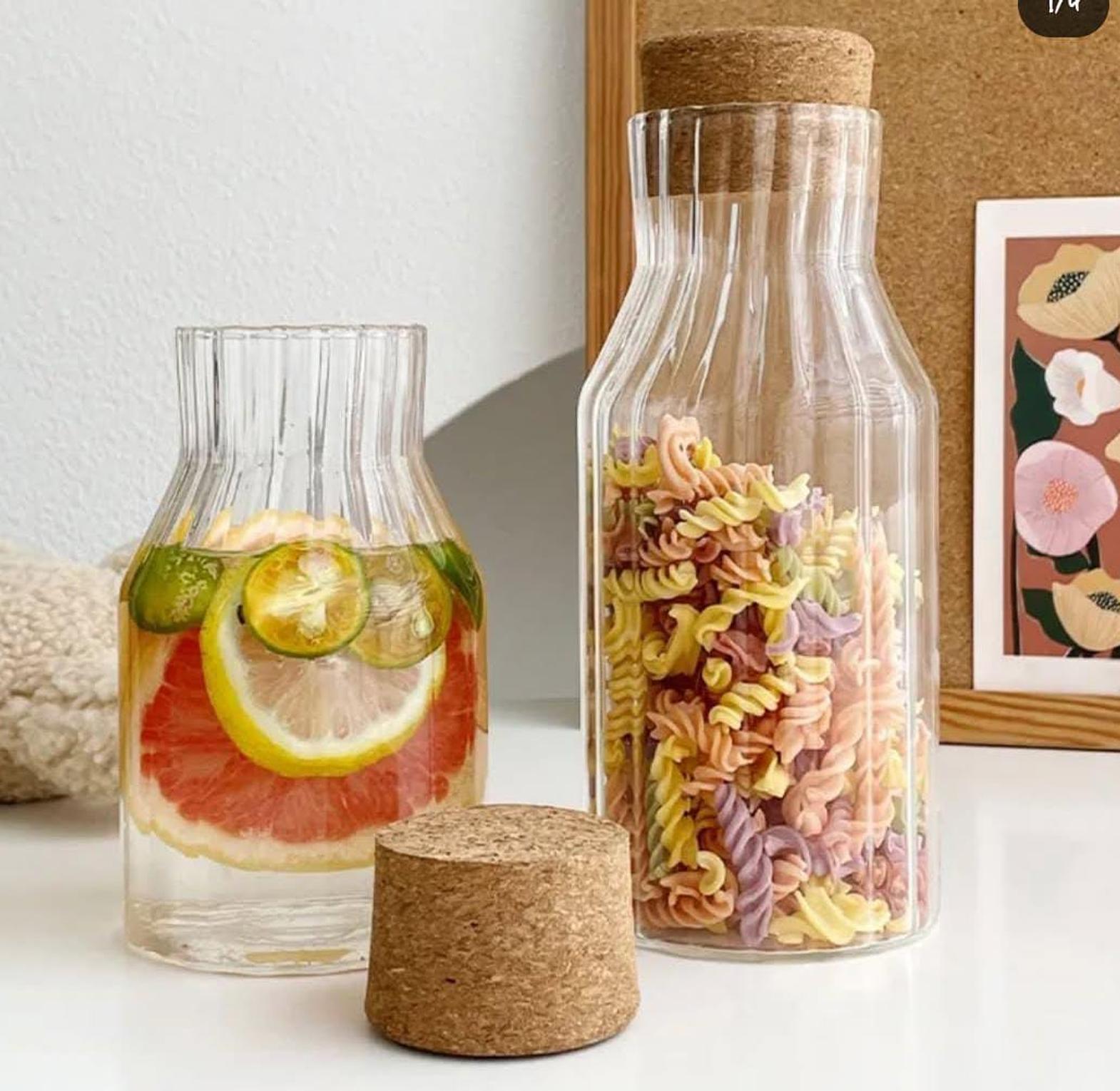 This ribbed glass bottle/pitcher with a wooden cork lid offers a stylish and practical way to serve and store water, juice, infused beverages, or even cold brew. The ribbed texture not only adds a touch of retro elegance but also improves grip and visual appeal, making it a standout piece on any table or countertop. Topped with a smooth, natural wooden cork lid, the pitcher keeps contents fresh while adding a warm, organic accent to the overall design. Its durable glass construction ensures safe, long-lasting use, while the generous opening allows for easy filling and cleaning. Whether used for entertaining guests or daily hydration, this piece blends beauty with function in a way that respects classic design and modern sensibilities.