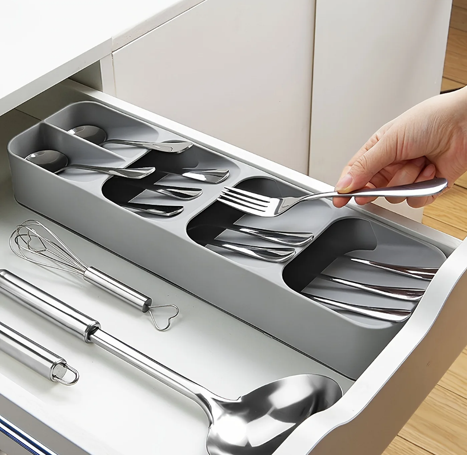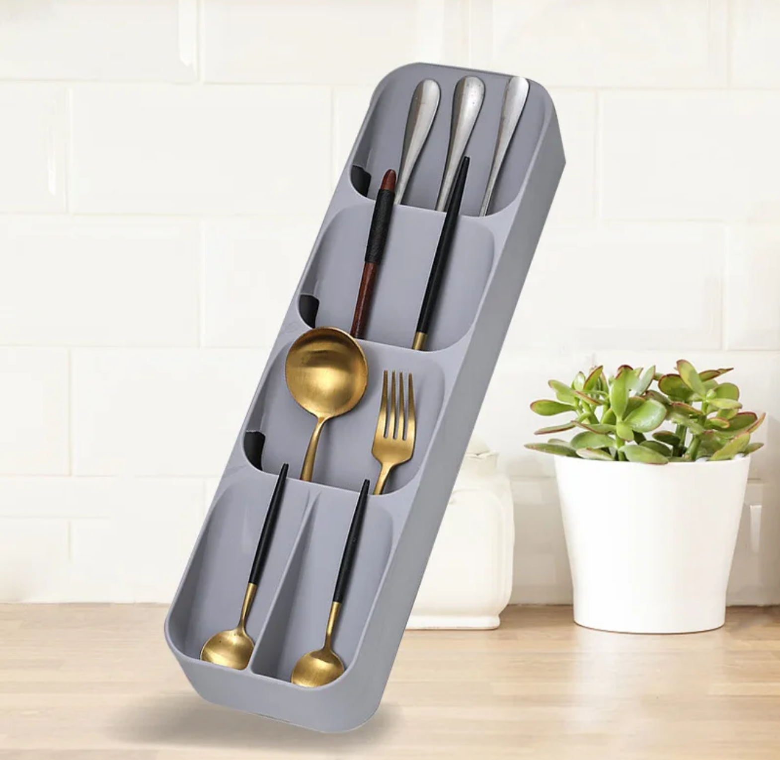 Keep your kitchen organized with this Slim Compact Cutlery Organizer, designed to maximize space without compromising on functionality. Measuring 39cm x 11cm x 5.7cm, it fits perfectly in most kitchen drawers or can be used as a tidy countertop solution. The smart, layered layout allows you to store forks, spoons, knives, and small utensils in a neat, accessible way—ideal for small kitchens, apartments, or minimalist setups. Crafted from durable plastic in a modern grey finish, it's both practical and stylish. A clutter-free cutlery solution for any kitchen looking to save space and stay organized.