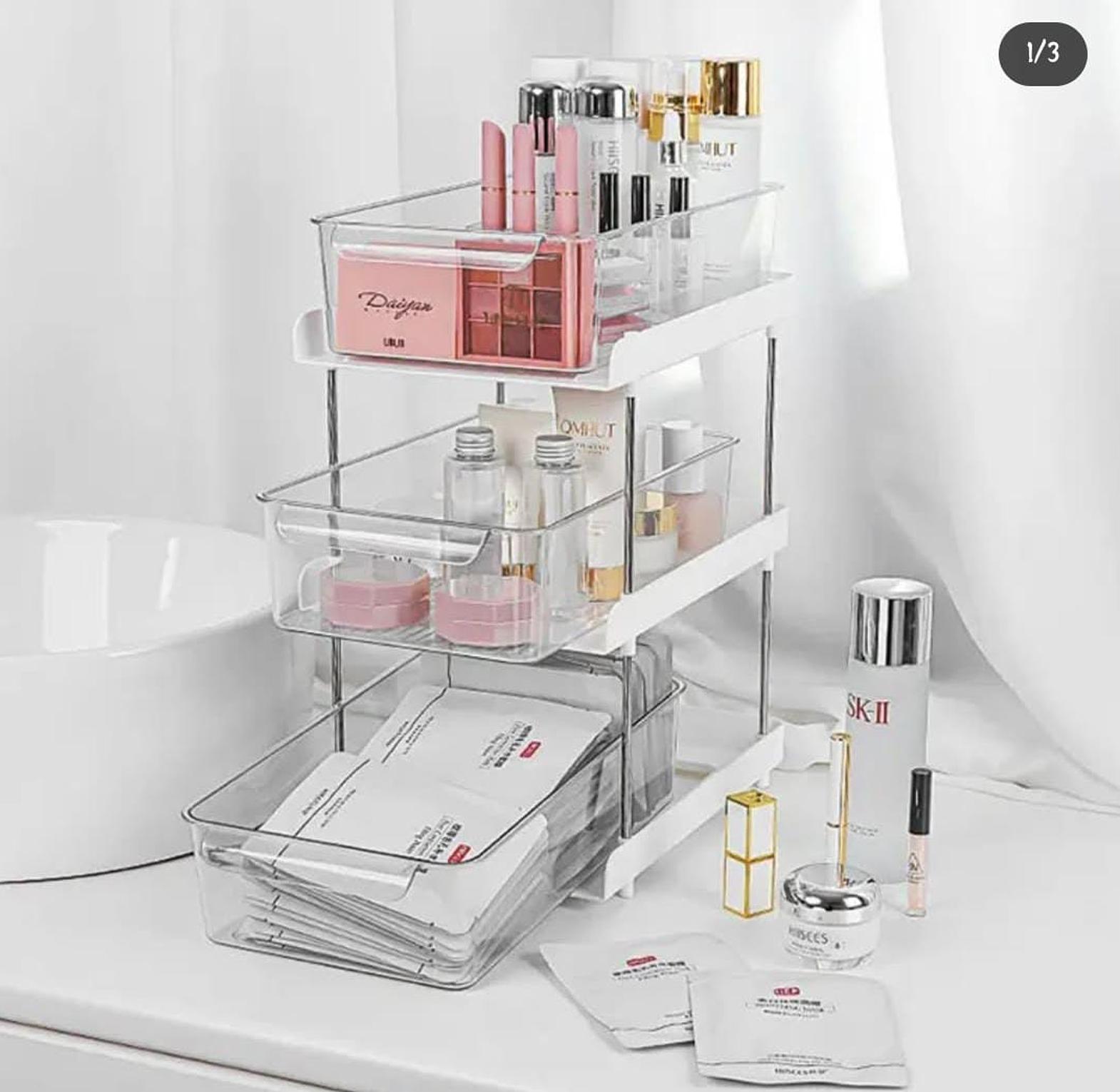 This three-layer organizer combines the transparency of pull-out acrylic drawers with the strength and durability of metallic stands, offering a smart and stylish storage solution for any room. Each drawer slides smoothly, providing easy access to stored items such as stationery, cosmetics, tools, or kitchen essentials, while the metallic frame ensures long-lasting support and stability. The clear acrylic design keeps contents visible, promoting quick organization and retrieval, while the metallic stands add a modern industrial touch that complements both traditional and contemporary interiors. Practical, durable, and elegantly designed, this organizer brings order to your space without sacrificing style.