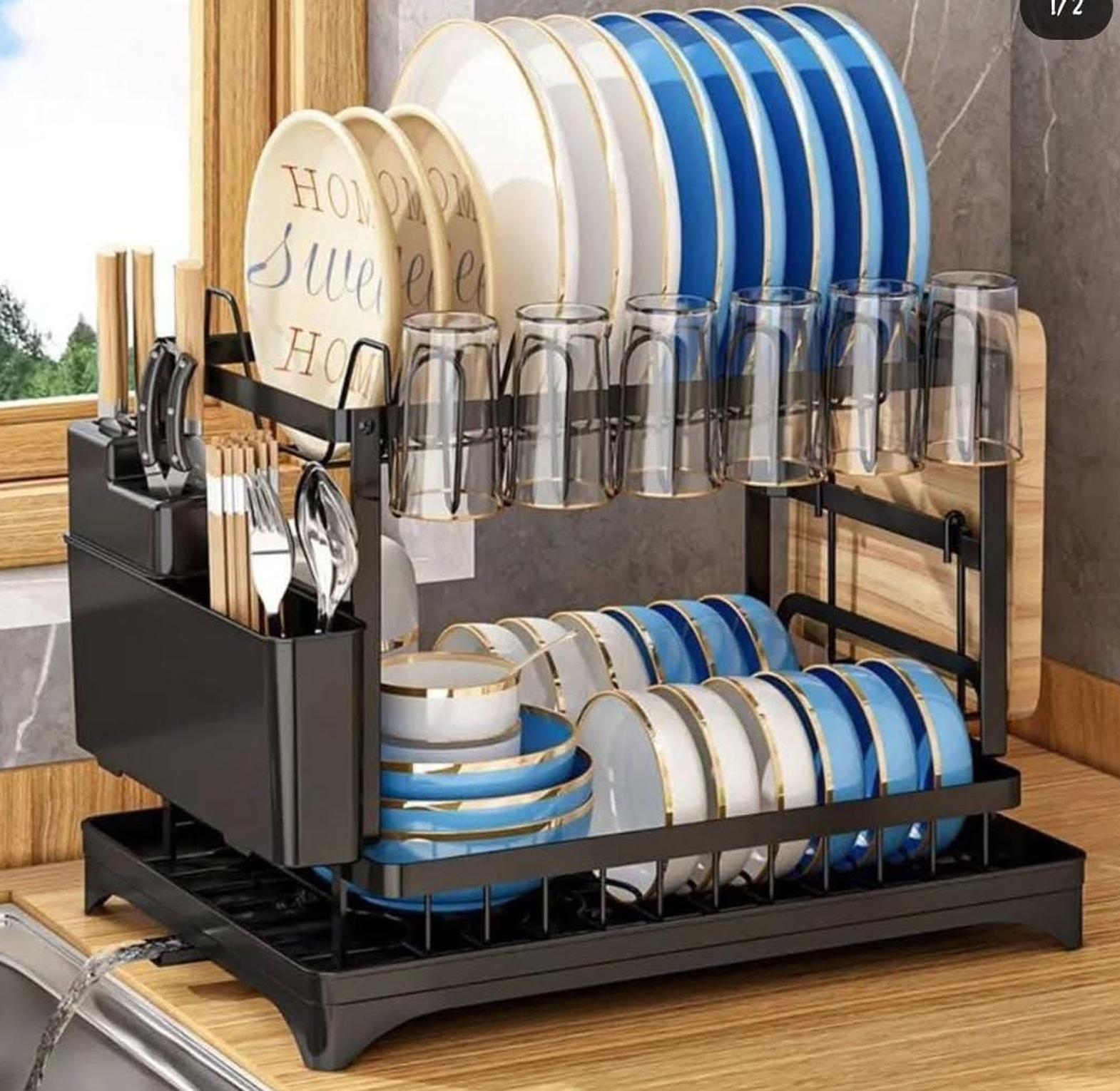 Our two-layer metallic dish rack is the perfect blend of style, practicality, and durability, offering ample space to dry and organize your dishes, glasses, and utensils. Crafted from rust-resistant metal, this rack features two levels, providing extra storage capacity for your kitchen essentials while ensuring quick drainage. The top layer is ideal for plates, bowls, and larger items, while the bottom layer accommodates cups, glasses, and smaller dishes. The sturdy frame is designed for stability, preventing tipping, and its sleek metallic finish adds a modern touch to your countertop. Whether you're washing a few dishes after a meal or handling a full load, this dish rack helps maximize space, streamline drying, and keep your kitchen looking tidy and organized.
