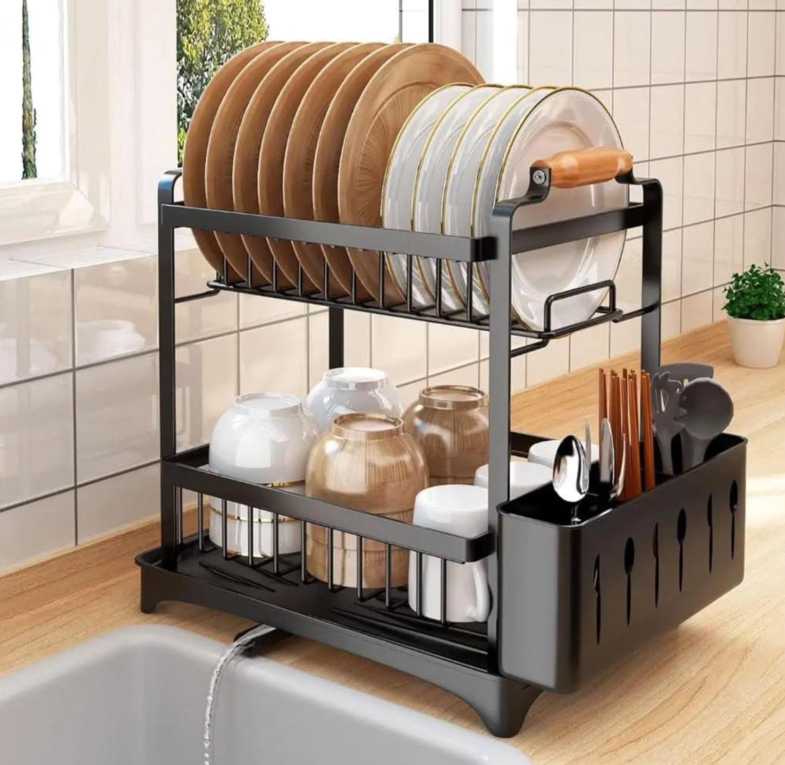 This two-tier metallic dish rack is built for both functionality and style, offering ample space to air-dry your plates, bowls, cups, and utensils without cluttering your countertop. Made from strong, rust-resistant metal, it’s engineered to handle daily use while maintaining its sleek appearance. The upper tier is ideal for larger dishes, while the lower tier accommodates cups and smaller items, with dedicated holders for cutlery and draining trays to manage excess water. Its space-saving vertical design makes it perfect for compact kitchens, delivering both efficiency and a clean, modern aesthetic. A reliable kitchen essential for those who value neatness and durability.