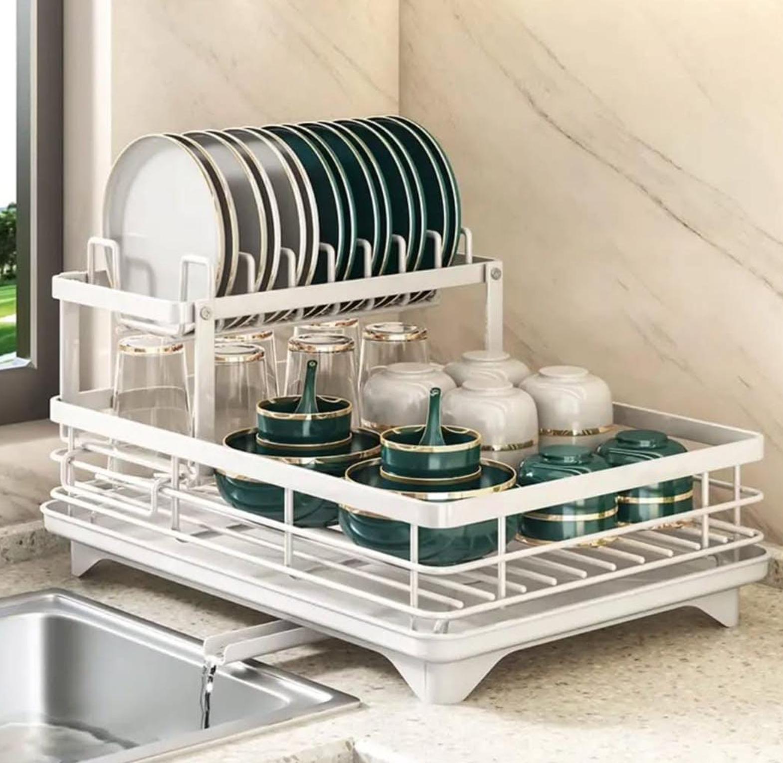 This two-tier metallic dish rack is built for efficiency and durability, providing ample space to dry plates, bowls, utensils, and cups in a compact footprint. Constructed from rust-resistant metal with a sleek finish, it withstands daily use while maintaining its clean, modern appearance. The dual-tier design optimizes vertical space, making it perfect for kitchens with limited counter room, while the integrated drip tray helps contain water and keep surfaces dry. Whether you prefer a traditional setup or a contemporary look, this dish rack brings practical organization and long-lasting functionality to your kitchen routine.