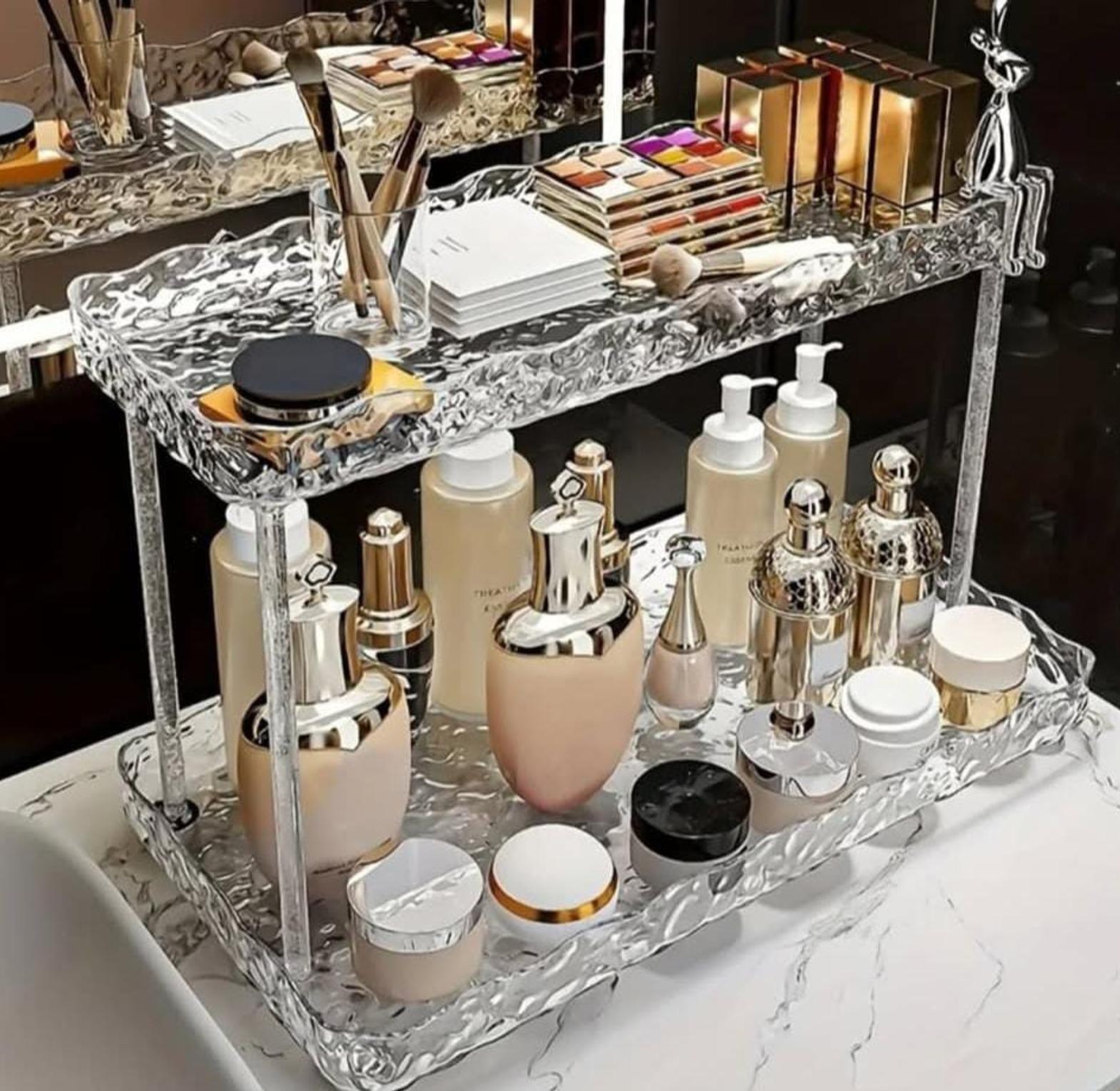 This two-tier organizing rack blends practicality with whimsical charm, making it a standout piece for your vanity, bathroom, or workspace. Constructed from sturdy plastic, it offers ample space on both tiers to neatly store cosmetics, toiletries, office supplies, or small kitchen items. The highlight of the design is a tasteful metallic rabbit accent, which not only adds a decorative flair but also serves as a functional handle for easy mobility. Compact yet spacious, the rack is ideal for keeping clutter off your surfaces while elevating your décor with its cute and contemporary aesthetic. Perfect for anyone who values both style and organization.